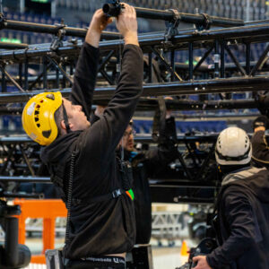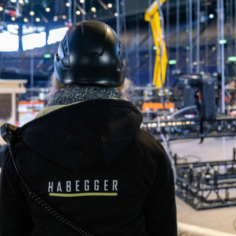 Sonntag, 29.01.23, 14 Uhr. Die Uhr an Andrea Barbens Handgelenk meldet sich mit einem dezenten Piepsen. Das Tagesziel von 10’000 Schritten ist bereits erreicht. «Das ist normal. Ein Grossevent hält fit», fügt die Project Assistent lachend hinzu und geht schnellen Schrittes durch die Katakomben des Hallenstadions in Zürich weiter. Es gibt noch viel zu tun. In vier Tagen findet die Premiere von Art on Ice 2023 statt. Überall stehen Cases voller Material, die Arena gleicht einem Ameisenhaufen – Habegger Mitarbeitende, Lieferanten, Freelancer und Helfer packen mit an. Insgesamt werden 140 Tonnen an Material verbaut, darunter 108 Lautsprecher, 388 Lampen und 334 Laufmeter an Traversen.