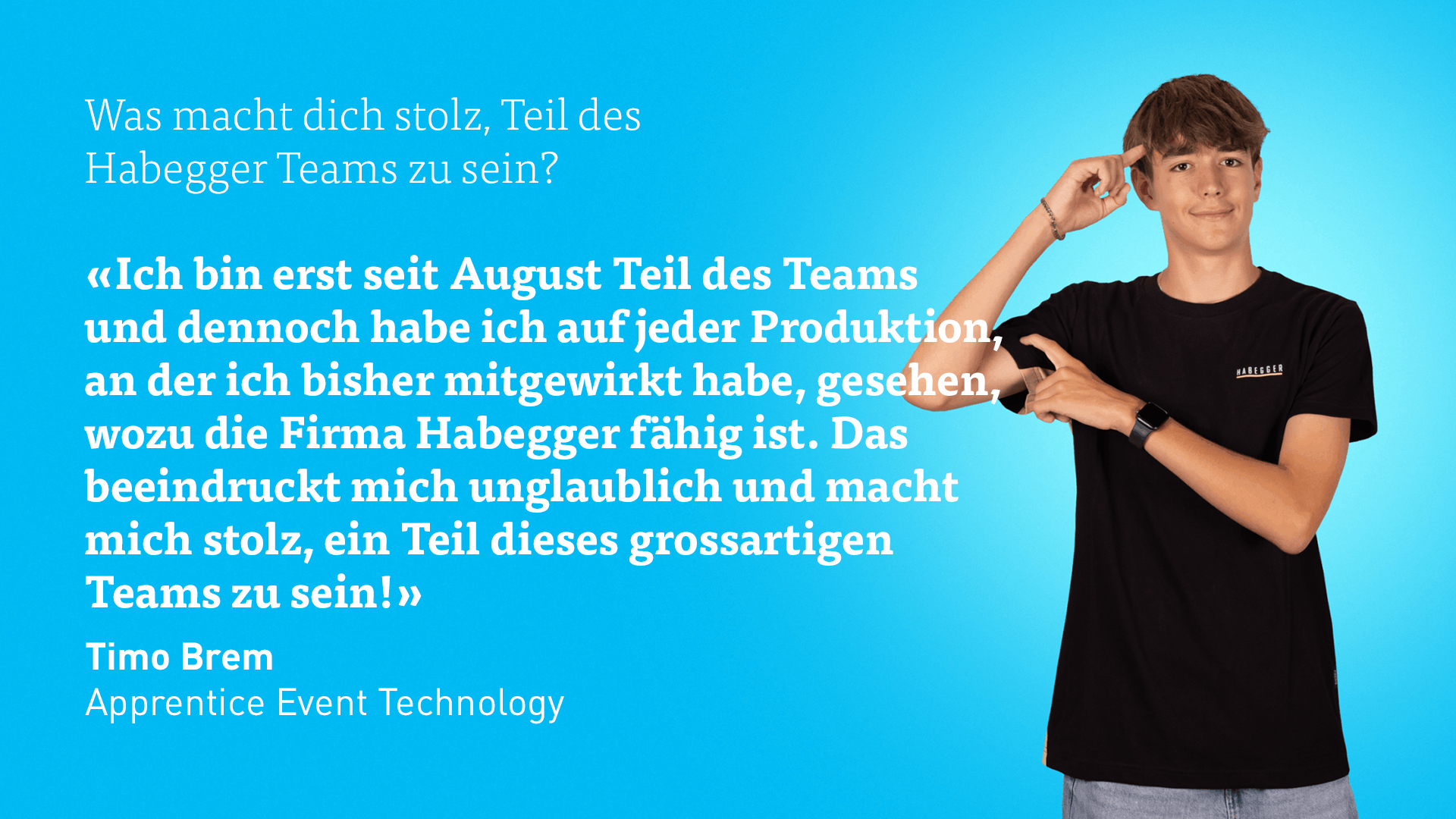 Als Vocational Trainer bei Habegger betreue ich seit 2025 alle Auszubildenden im Bereich Eventtechnik. Dabei geht es nicht nur darum, Lerninhalte aufzubereiten, sondern die jungen Talente fachlich und persönlich zu begleiten.