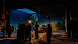 Nutze unser LED-Studio für täuschend echte Aufnahmen. Durch das installierte Camera-Tracking in unseren Studios bewegt sich der Hintergrund auf der LED-Wand immer mit der Kamera mit. Somit kannst du Autofahrten simulieren oder Berge besteigen, ohne dass du tatsächlich auf die Strasse oder in die Natur musst. Sprich: Du kannst Filmaufnahmen unter kontrollierbaren Bedingungen machen und sparst dadurch Zeit sowie Geld.