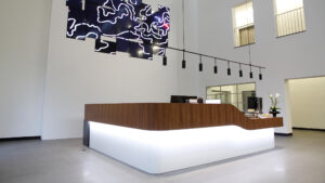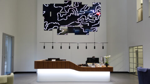 Habegger war für die Ausarbeitung des Designs, die technische Umsetzung sowie für den Bau des neuen Empfangsbereiches zuständig. Dazu gehörte die Installation einer interaktiven Screen Wall sowie der komplette Innenausbau.