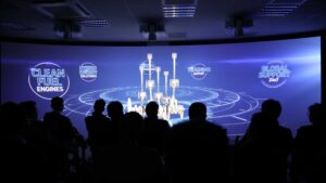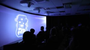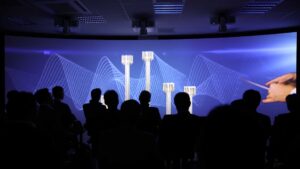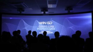 Die Wall (8m x 2.5m) ist eine Spezialanfertigung und in Zusammenarbeit mit unserer inhouse Schreinerei Gil & Ruiz entwickelt und umgesetzt worden. Die Wand besteht aus mehreren Elementen, welche durch ein spezielles Glasfasergewebe verbunden ist und somit die Wand wie aus einem Guss erscheinen lässt. Die drei Projektionen, welche perfekt mit der Projektionswand harmonieren zeigen den WinGD Imagefilm, welchen wir neu konzipiert und durch aufwendig produzierte 2D- und 3D-Animationen erweitert haben. Der Imagefilm war ein zentraler Bestandteil, in dem die historischen Meilensteine auf kreative Art visualisiert wurden. Durch die Kombination aus Bild und Ton entsteht ein immersives Erlebnis, dass die Innovationskraft und Tradition des Unternehmens in den Vordergrund stellen und der Zuschauer in die WinGD Welt einzutauchen kann.