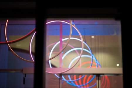 Das Herzstück des Faceliftings bildete das Foyer. Wir griffen bestehende architektonische Elemente des unter Schutz stehenden Gebäudes wie Metallträger oder Sichtbetonwände auf und setzten sie mit einfachen, aber effektvollen Massnahmen in Szene. Ein besonderes Augenmerk legten wir auf die Beleuchtung. Ein Himmel aus Glühbirnen taucht den grossen, offenen Raum in ein warmes, ruhiges Licht und sorgt für ein festliches sowie einladendes Ambiente. Installierte Schweinwerfer lassen sich als zusätzliches Feature separat ansteuern. Dies ermöglicht ein Ambiance-Licht im individuellen Brandlook.