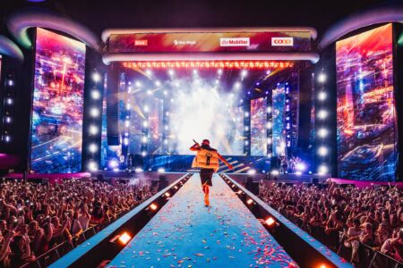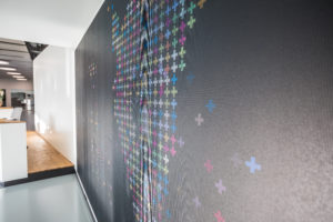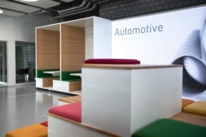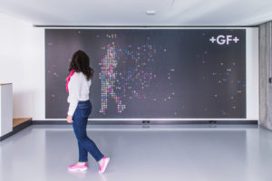 Ein Hingucker bilden die beeindruckend grossen interagierenden LED-Wände. Die Erste begrüsst und überrascht jeden Besucher, indem sie ihm direkt seine Silhouette im Georg Fischer Branding abbildet. Auf der Zweiten können über Gesten interaktiv Informationen zum Unternehmen abgerufen werden. Die Kombination dieser multifunktionalen LED-Wand mit der gegenüberliegenden Sitztribüne macht den Willkommensbereich ausserdem zu einem hervorragenden Präsentationsraum.