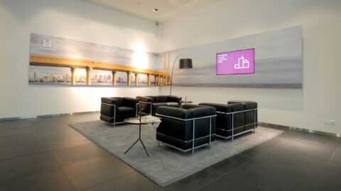 Im Auftrag der Peter Schmidt Group waren wir für die Arbeiten vor Ort verantwortlich und übernahmen neben der Licht- und Screeninstallation, die Umsetzungsplanung für die Innenraumgestaltung sowie die visuelle Kommunikation.