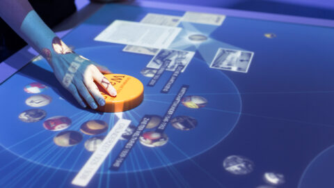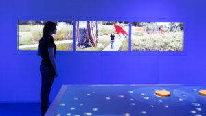 Das «Regal der Geschichte» ist eine Videowand, deren Inhalte die Besucher mit Gestik selbst steuern. Der 4 m2 grosse Multi-Touch-Table kann durch Fingerbewegungen und Objekterkennung nach Zeitdokumenten durchstöbert werden. Aber auch die Green Box, der Face-to-face-Mirror, der Filmfundus und das digitale Fenster mit Blick in den Garten sind Teile der interaktiven Installation.