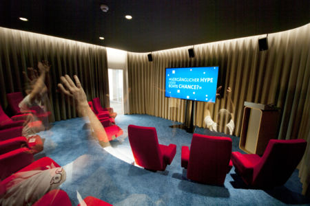 Der 300m2 grosse Promotionsstand bestand einerseits aus einem Aussichtsturm mit LED-Bespielung, der sowohl Blickfang als auch Treffpunkt für die Besucher war. Andererseits aus drei kreisförmigen Bereichen mit Interaktionselementen. Um diese Elemente zielgerichtet in Bewegung zu setzen, waren die ESAF-Besucher angehalten, ihre eigene Energie zu nutzen. Die Station #stromimblut umfasste ein grosses Laufrad, das durch die Besucher selbst angetrieben wurde und mit einem Gewinnspiel verbunden war. Das Kampagnen-Keyword #krafttanken wurde mit einer Sprühspirale und einem einzigartigen Wasserspender aus Stahl unterstrichen, die den Besuchern die nötige Erfrischung boten. Als weiterer Eyecatcher diente eine Schaukel, die den Gedanken von #powerofsharing aufnahm. Drei Besucher mussten synchron schaukeln, um einen überdimensionalen Stromstecker zum Leuchten zu bringen.