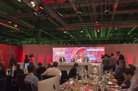 Wir waren für die Ausführungsplanung und Umsetzung von Licht-, Video- und Audiotechnik zuständig und verantwortete ebenfalls die Simultan Übersetzungstechnik. Die grosse Herausforderung bestand darin, drei Hallen gleichzeitig mit ca. 450 Tonnen Material auszustatten. Insgesamt wurden 5’200 Leuchtkörper installiert. Für den ganzen Anlass wurden 42 Trucks mit Material beladen und ein Team von 195 MitarbeiterInnen eingesetzt.