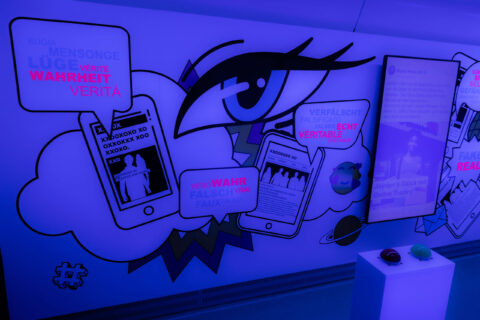 Angefangen mit einem überzeugenden Konzept, bei dem das Besuchererlebnis im Vordergrund stand, über die Planung bis hin zur visuellen Gestaltung wie inhaltlichen Entwicklung und anschliessenden Umsetzung des Themas Fake News. Auch der Innenausbau war Teil unseres Auftrages. Diesen haben wir mit unserem langjährigen Partner und unserer hauseigenen Schreinerei Gil & Ruiz zusammen ausgearbeitet.