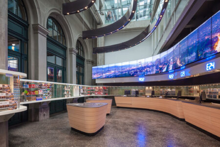 Habegger realisierte den „Media-Dome,“ in welchem eine Watchout-Show über 6 Beamer präsentiert wird. 3 elektrische Leinwände, je 820 x 550 cm gross, fahren automatisch aus der Decke, gesteuert über eine AMX Mediensteuerung. Untermalt wird die ganze Show durch ein 5.1 Dolby Digital Soundsystem von Bose.