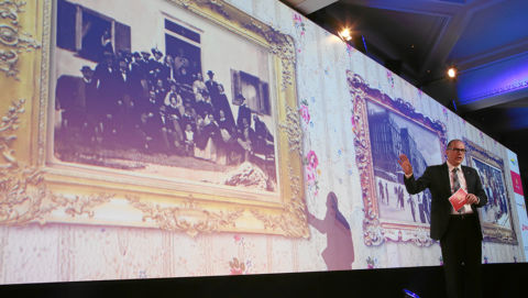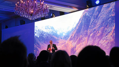 Die aussergewöhnlich breite Projektionsfläche wurde mit vier Projektoren bespielt. Die Inhalte wurden zuvor in Watchout zu einer nahtlos animierten Präsentation zusammengestellt und vor Ort mit drei Rechnern ausgespielt. Nicht ganz leicht war es, an den tief hängenden Kronleuchtern im Corviglia Saal des Hotel Kulm vorbei zu projizieren.