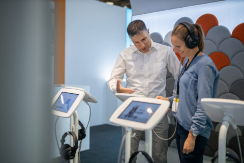 Unser Ansatz «Take care» teilt den Stand in drei Zonen und informiert die Standbesucher auf interaktive Weise über Ausrüstung, Hilfsmittel und Kontaktstellen.
