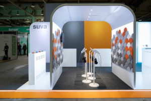 Der Messestand überzeugt durch ein einzigartiges Design: wellenartige, fliessende und kantenfreie Formen bilden dabei das Herzstück. Dank seiner modularen Zusammensetzung kann der Stand in drei Grössenvarianten aufgebaut werden.