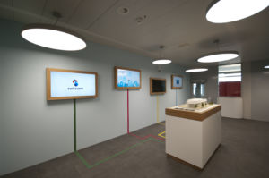 In der Besucherzone planten und installierten wir modernste Multimediatechnik, sowie deren Steuerung. Im Sitzungszimmer und Medienraum werden Licht, Monitore, Sound und Sichtschutz mittels Touchscreen-Applikation gesteuert. Zur neuen Ausstattung gehört auch ein «Barco ClickShare System», die erste zuverlässige Lösung für eine kabellose Verbindung von Notebook und Präsentationstechnik. Zudem wurden diverse hochauflösende Bildschirme und ein WLAN für die Kommunikation der Medientechnik installiert.