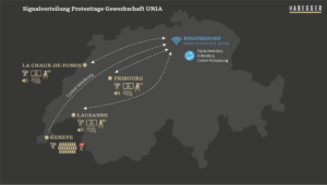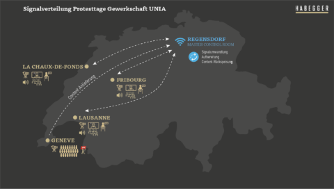 Dabei wurden die Signale in unsere zentrale Regie in Regensdorf übertragen, aufbereitet und schliesslich mit dem finalen Bild nach Lausanne, Fribourg, La Chaux-de-Fonds und Genf zurückgesendet und dort jeweils auf grossen LED-Screens und Projektionen dargestellt. Dadurch konnten Personalressourcen in der Romandie minimiert werden: Die vier Locations wurden von je einem Techniker sowie einem Kameramann betreut. Im Rahmen des hybriden Events setzten wir auch einen Livestream für die Social Media-Kanäle von UNIA um.
