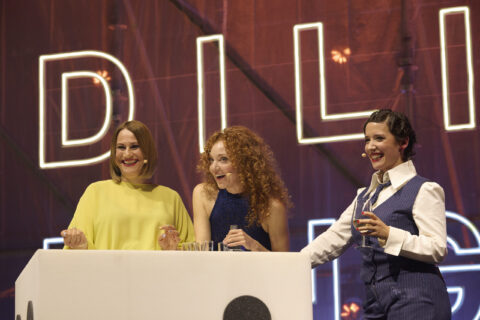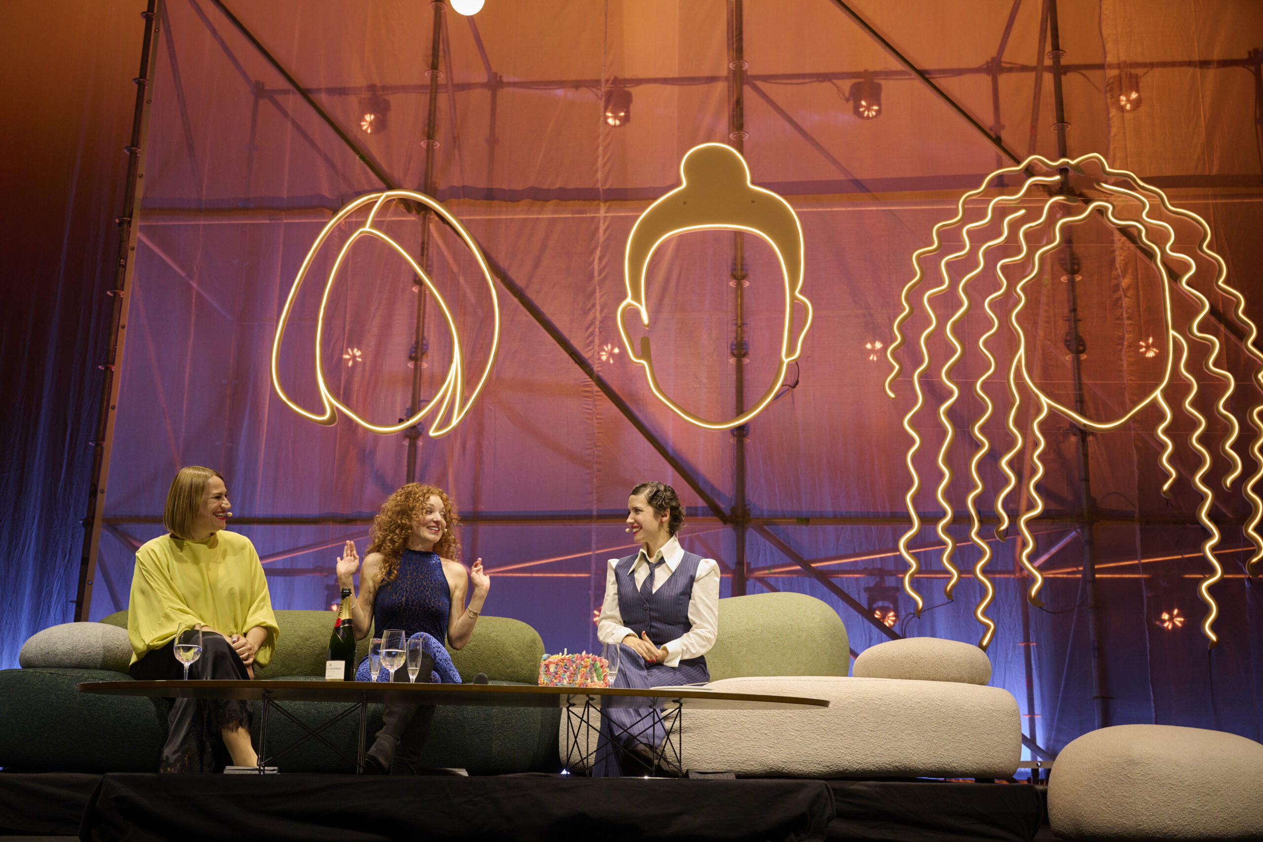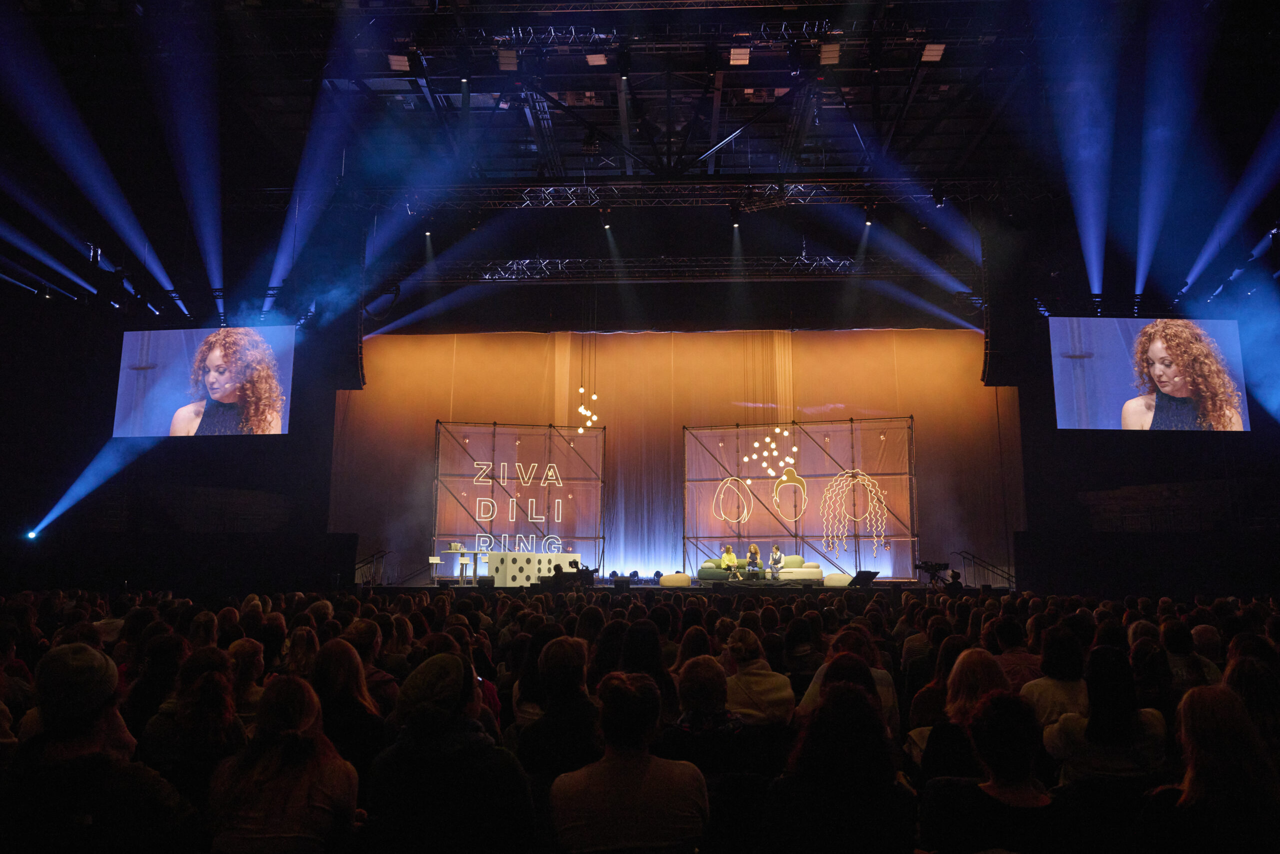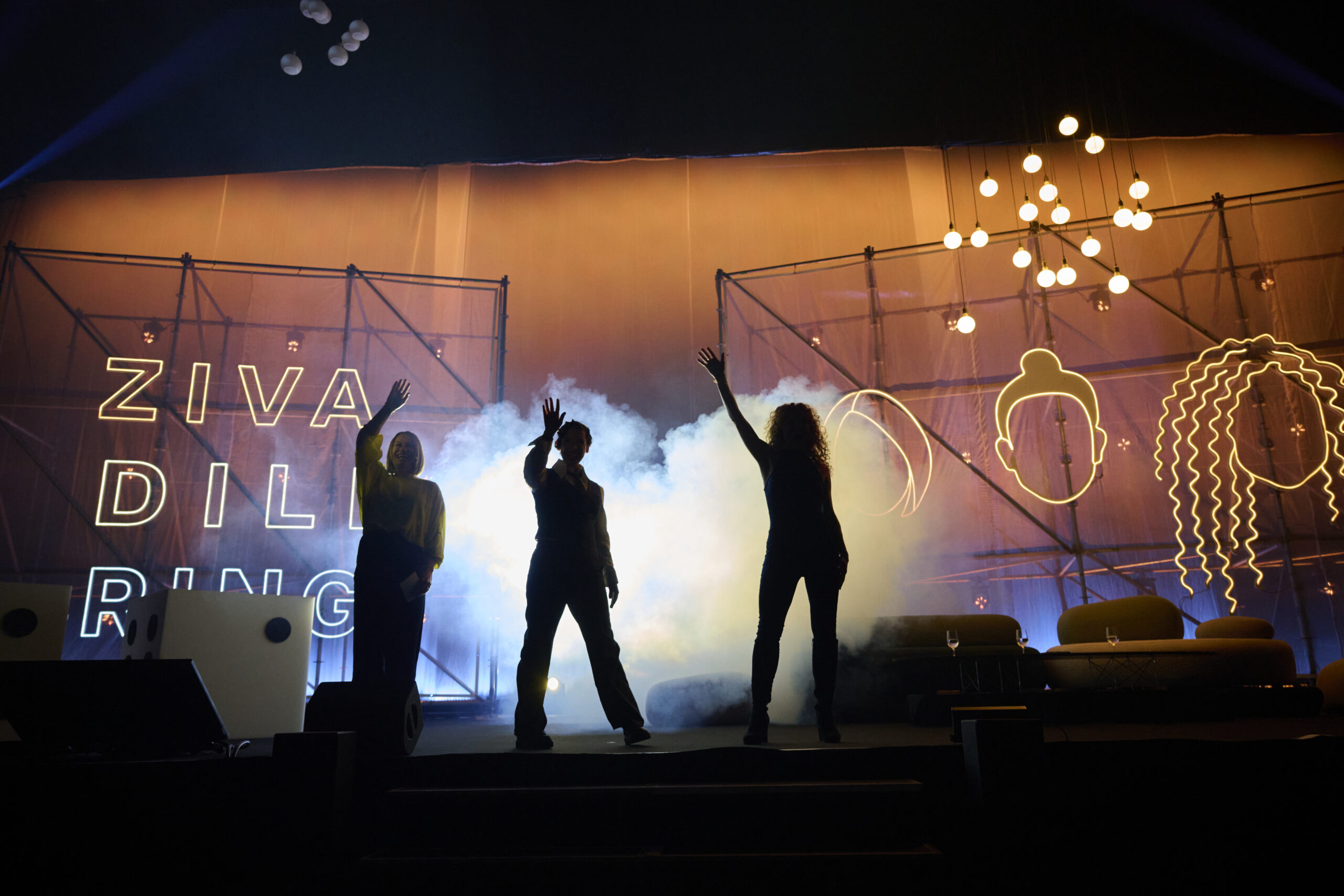 Das grosse Ziel war, ein möglichst authentisches und zugleich intimes Bühnenbild zu schaffen, das dem bekannten «Zivadiliring-Format» gerecht wird. Dafür integrierten wir charakteristische Objekte aus dem Podcast, wie überdimensionale Würfel, den Neonschriftzug «Zivadiliring» und die Silhouetten der drei Gastgeberinnen. Die Herausforderung bei einer «One-Off Show» lag zudem im engen Zeitplan: Ab 6 Uhr morgens wurde in der leeren Halle aufgebaut, ab 14 Uhr waren die Proben, und bis 18 Uhr musste alles bereit sein für die Show. Trotz der hohen Komplexität dieses ambitionierten Programms setzten wir die anspruchsvolle Planung mit grösster Präzision und Zuverlässigkeit um.