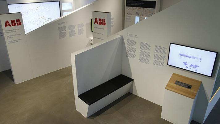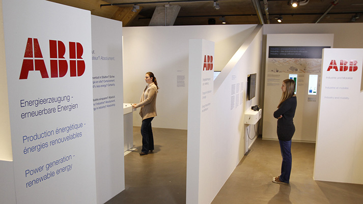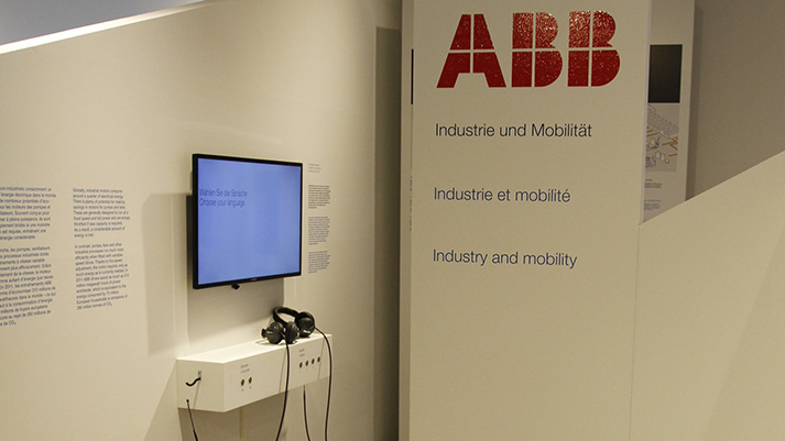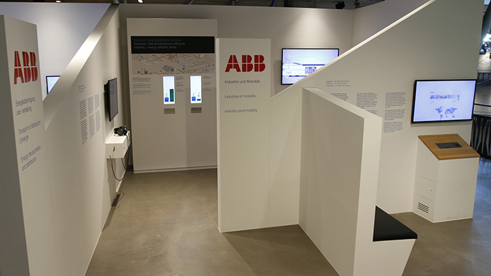 We were involved in the conception and planning of the exhibition and was responsible for the designing of the booth and construction management on site. The exhibition is divided into three “houses”, in which you can find one exhibit and a video station to a certain topic. To do this, already existing ABB videos were prepared and in parts subtitled. In addition, there is an information booth, at which people could get information on open positions at ABB. We were also responsible for the media control system of the audio and video installations.