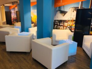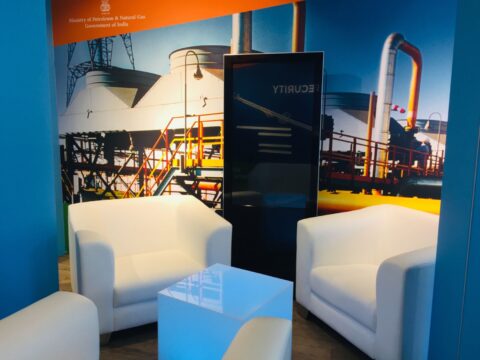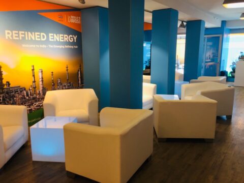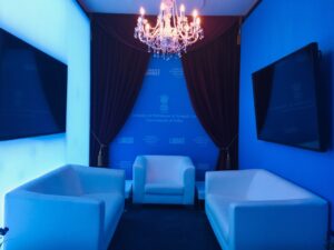 For this assignment, we wrote the scenographic space concept and took care of everything from creation to realisation. On a total of 170 m2, a Ministry Lounge was created for the reception of invited guests, as well as a CEO Lounge, which was mainly used for exchanges and as a workplace for the employees. We installed new walls and floors, set up screens and provided the appropriate furniture and decoration. A special feature was the installation of a glazed meeting room. During this time, in addition to the technical support on site, we also took over the organisation of the operational infrastructure.