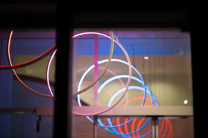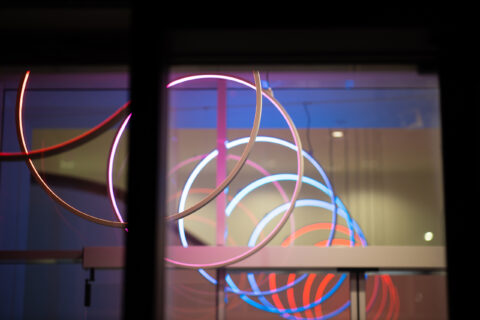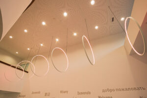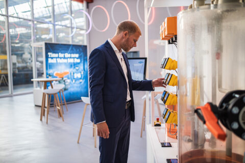 Habegger realised right from the start that, in order to not only showcase GF Piping Systems’ work, but also communicate what it actually does, a carefully thought-out guided tour for visitors was needed. An LED installation hanging from the ceiling was chosen as the central element to symbolise the pipes and pipelines that are frequently used by GF Piping Systems. The luminous rings, lined up in a row, form a channel from the entrance to the end of the hall, allowing the viewer’s gaze to wander. Spread throughout the room, specially developed exhibits present the complex solutions from GF Piping Systems: on the one hand, the areas of application that customers are familiar with are shown, while on the other, visitors are given an insight into the part of the product that is normally hidden behind a wall. Finally, at the other end of the hall, in the specially designed video lounge, a digital demonstration invites visitors to take a tour of the factory.