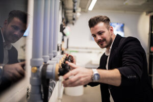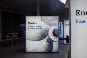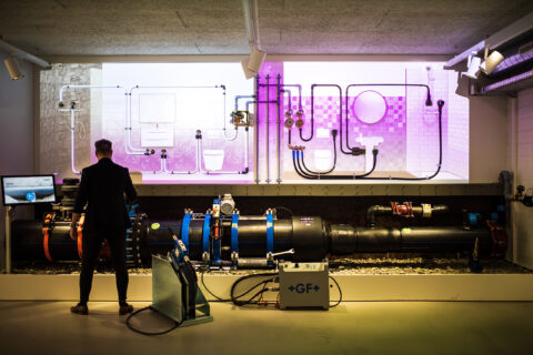 GF Piping Systems is the global expert in the secure and reliable transport of water, chemicals and gases. The company specialises in piping systems made from plastic and system solutions with service covering all project phases. GF Piping Systems wanted to offer visitors to its company headquarters in Schaffhausen a lasting and educational experience. As part of the redesign of the spacious entrance hall, the brief therefore also included the development and integration of a product showcase. Directly adjacent to the entrance hall, there was also to be an exhibition area featuring a tour of the plant which would also be connected to the visitor experience.