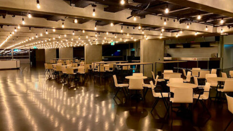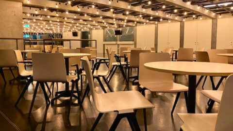 The centrepiece of the facelift is the foyer. We picked up on existing architectural elements of the listed building, like metal supports and exposed concrete walls, and showed them to best advantage using simple yet effective measures. We paid particular attention to lighting. A sky of lightbulbs bathes the large, open space in warm, calming light, creating an ambience that is both festive and inviting. Installed spotlights can be controlled separately as an additional feature – this allows for ambience lighting in an individual branded look.