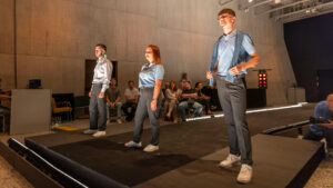 In order to put the focus on the modern yet elegant garments, we created a minimalist stage design. The central element was the catwalk, which stood out only discreetly from the floor and thus expressed the closeness of Swiss Post to the population or the audience present. The unobtrusive use of event technology further emphasised this ambience and appropriately set the scene for the models, all of whom were Swiss Post employees.