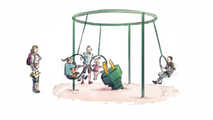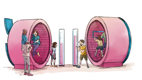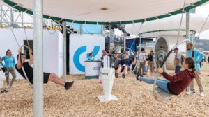 The 300m2 promotional stand consisted of a viewing tower with LED display, which was an eyecatcher and also served as a meeting place for visitors, and three circular areas with interactive elements. The ESAF visitors had to use their own energy to set these elements in motion in a targeted way. The #stromimblut (meaning “electricity in the blood”) station comprised a large wheel that was driven by the visitors themselves and was linked to a competition. The campaign keyword #krafttanken (“recharge” in English) was underscored by a spray spiral and a uniquely designed steel water dispenser, offering visitors the necessary refreshment. A swing, which picked up on the idea of #powerofsharing, served as a further eyecatcher. Three visitors had to swing in sync to light up an oversized power plug.