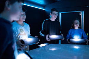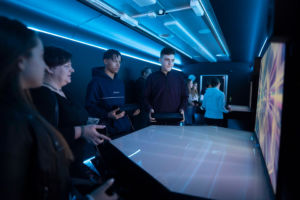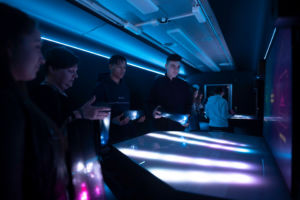 Each of the two tables has six voting stations. Questions on the topic of mobility appear on the screen in front of the students. By means of a voting prism, a geometric construct that behaves as if it contained a luminous liquid. Participants can make their selection by means of a tilting movement to the left or to the right. Once the selection is logged in, it is transmitted to the large screen via a futuristic animation, where the result is visible to everyone.