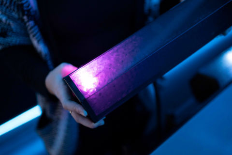As is well known, attention is always higher if there is an element of the unknown that arouses curiosity, and when different senses are addressed. For these reasons it was important for the interactive survey to develop a tool that sets itself apart from the familiar touch screens and buttons. The voting prism was the result of a cooperation with our partner company Naut GmbH, which supported us intensively during its development. The prism consists of darkened Plexiglas, on which several film layers were applied at different distances. The ingenious construct creates an effect which could be described as “extraterrestrial”. The colourful light, which appears to be a luminous liquid, flows through the cylinder and finally lands on the screen.