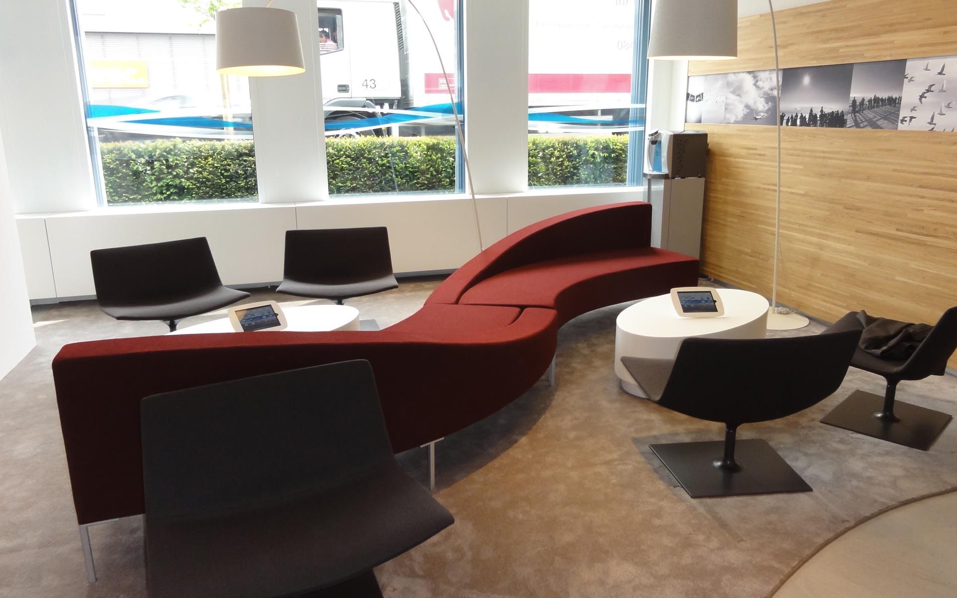 In addition, we installed an audio system, which can be controlled in zones and a screen line in the waiting area. We also produced the content for the screens and shows employees and the current topics of the bank.