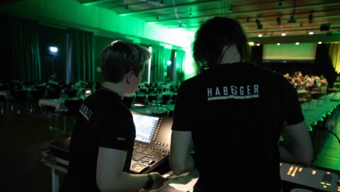 She drew and simulated the planned lighting design in the CAD software. During this process, Eileen was regularly in contact with her vocational trainer and other Habegger experts in order to harmonise needs, wishes and feasibility. They discussed electricity calculations, defined the number of cables and booked the materials. Since it was a non-profit event and therefore there was no big budget, Eileen had only the existing Habegger material at her disposal. Together with Fabrice, also an apprentice at Habegger, they prepared the programming of the lighting console.