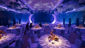 la transformation complète de la salle de bal avec un nouveau tapis, un concept lumière et audio créant une atmosphère unique