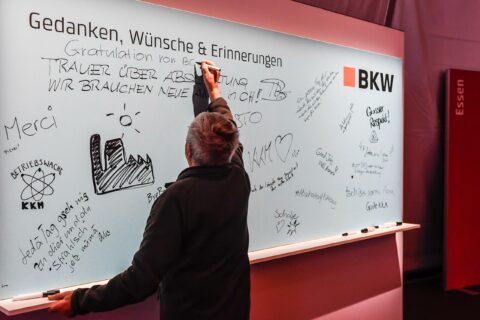 Le point culminant a été atteint avec l’évènement centré sur le moment de la désactivation avec 360 invités issus des milieux de la politique, de l’économie et du secteur. Les collaborateurs de la centrale ont vécu ce moment unique entre eux. La mise en scène officielle de l’arrêt du réacteur a été diffusée en live à la télévision suisse. Le même jour, une conférence de presse et une manifestation ont également eu lieu sous la tente dôme de 30 x 55 mètres sur le site de la centrale nucléaire pour les habitants des communes environnantes. Le jour suivant, la BKW a remercié les collaborateurs de la centrale avec un autre évènement pour le fonctionnement durant les années précédentes.