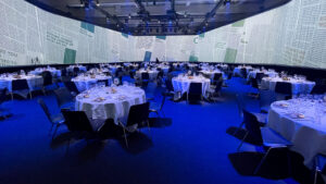 La salle Halle am See à Walenstadt a été complètement redécorée avec le branding «Great Company» – de la signalétique aux menus, en passant par un jingle adapté et une projection à 360° animée. Le magazine comportant les portraits des collaborateurs sur le départ a été distribué aussi bien en format PDF que sous forme imprimée. En même temps, différents contenus ont été animés de manière sophistiquée avec une projection à 360° dans l’espace entier. Cette expérience immersive a entouré les invités et attiré leur attention sur la scène centrale ainsi que sur le mur à LED, nous permettant de jouer habilement sur tous les plans dramaturgiques. Le story telling convaincant a relié les différents ilots de représentation de manière élégante. Tout cela a permis d’organiser une soirée extraordinaire, pleine d’émotions et de souvenirs communs.