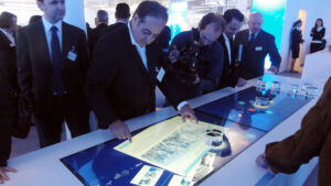 Chaque table est composée de 18 cylindres en verre, chacun représentant une branche industrielle d’EATON. Si l’on pose un tel cylindre sur la zone multitouch, le logiciel reconnaît le secteur industriel et l’arbre d’informations correspondant apparaît. L’utilisateur peut ensuite déplacer, zoomer, tourner, ouvrir et fermer librement les objets.