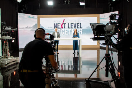 Les parois LED impressionnantes interactives attirent tous les regards. La première salue et surprend chaque visiteur en représentant directement sa silhouette à l’image de marque Georg Fischer. Sur l’autre, les gestes peuvent être utilisés pour appeler de manière interactive des informations sur l’entreprise. La combinaison de parois LED multifonctionnelles et de la tribune opposée fait également de l’espace d’accueil une excellente salle de présentation.